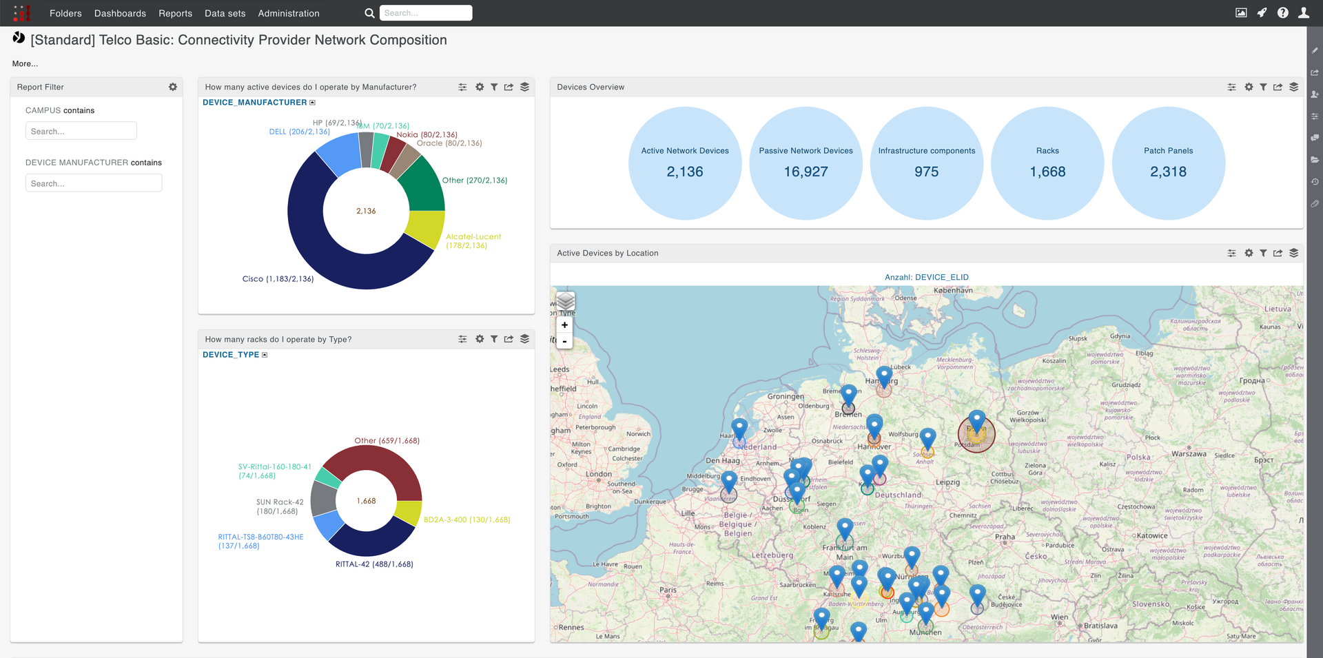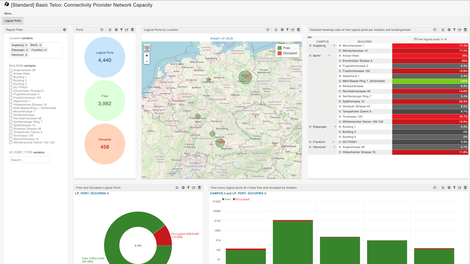 Break down the number of devices and logical ports operating within your Telco network, with comprehensive insights into device types, their functions, physical locations network links, and whether they are free or occupied.