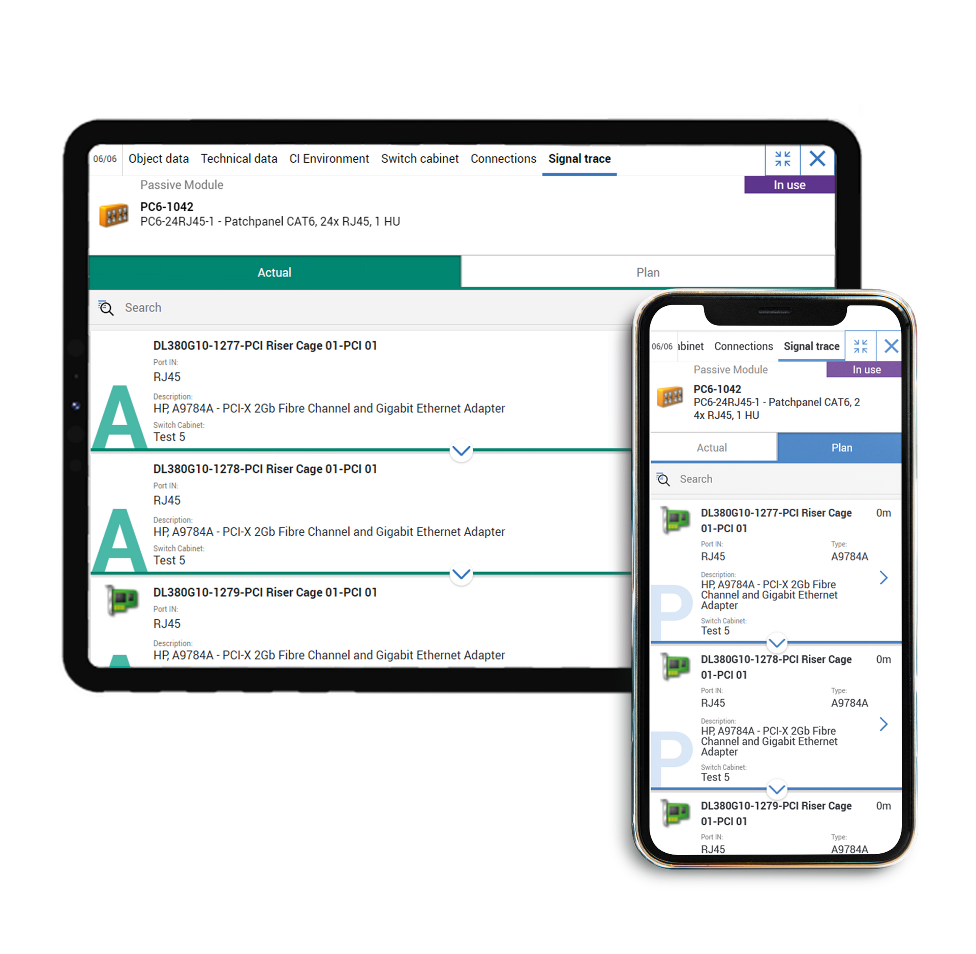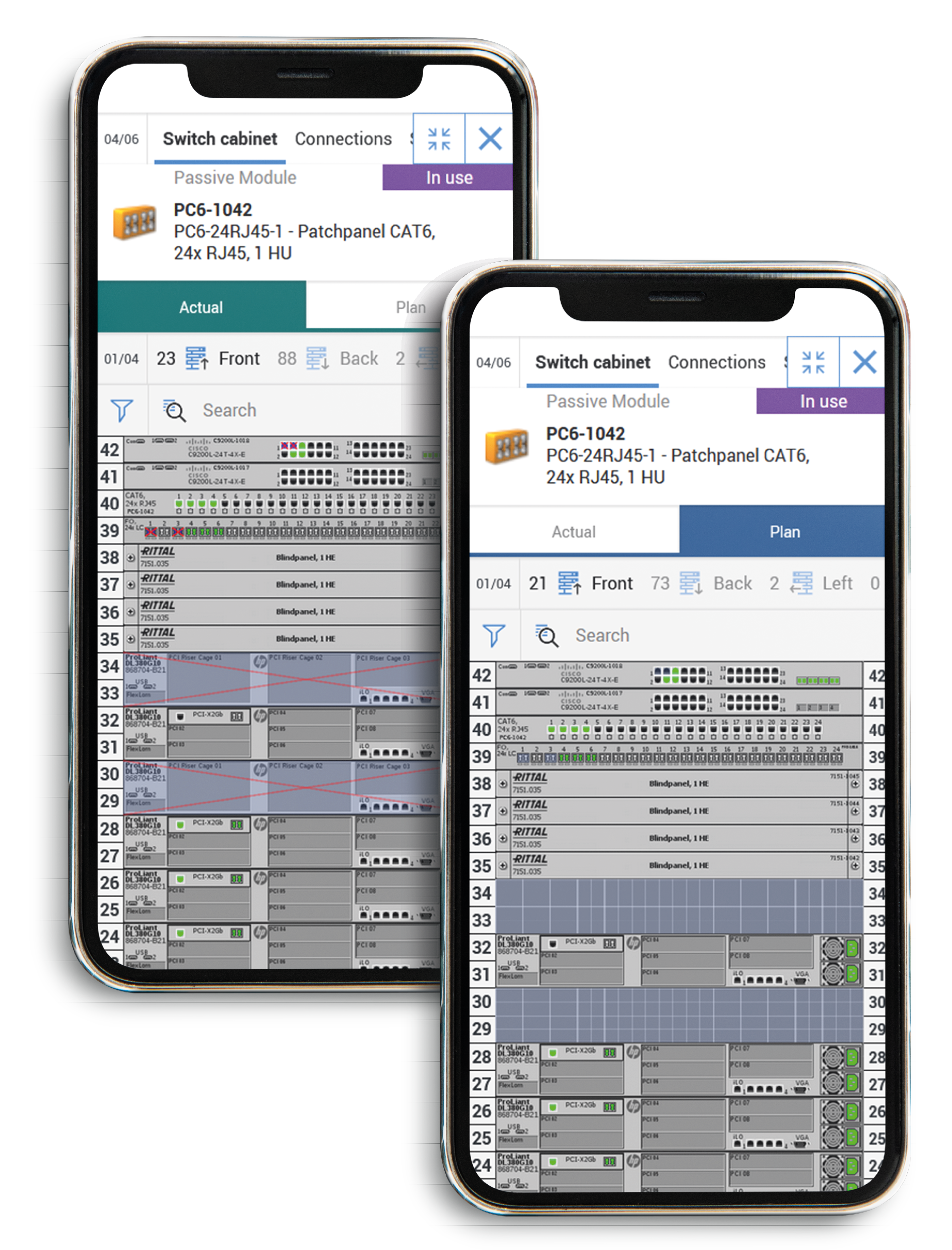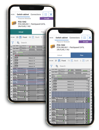 Racks are displayed in a realistic manner with all components and with views from all sides, as users are accustomed to from FNT Command. In addition, different color coding makes it immediately apparent whether components are in the planned or actual status.
