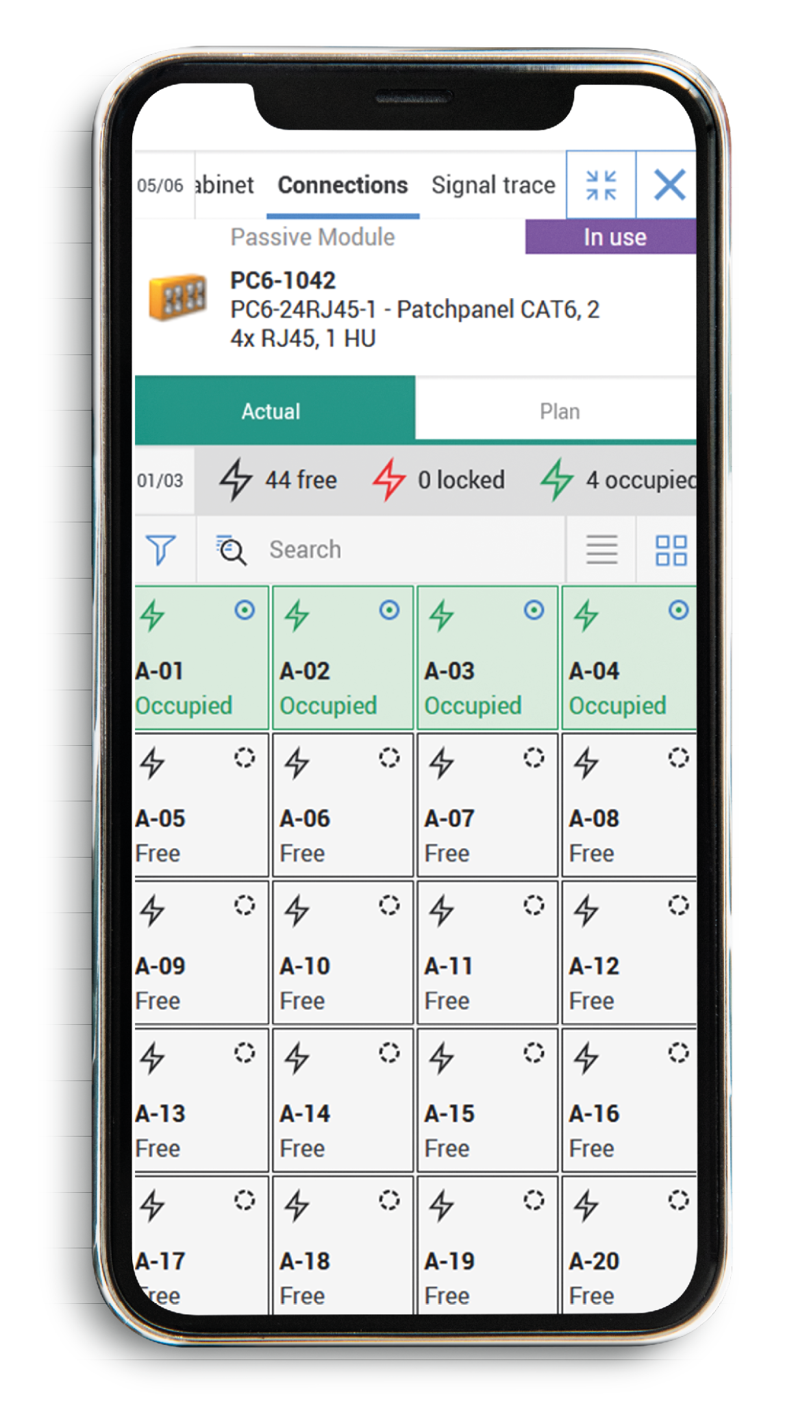 For each component, the respective ports and their status (free or occupied) can be clearly displayed – similar to the allocation list in FNT Command. - Signal paths