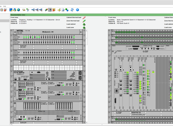 Representation of switch cabinets is true to life. The user can thus create a visual image of the actual cabinets. The graphics used are part of the delivery scope of the C base product library (CI Library). The graphics used are sensitive, which means that collision consideration, port assignment, and database information can all be queried directly. Switch cabinet planning and the option to select the planned or actual view are part of switch cabinet functionality. For each switch cabinet, four installation sides are available; the user can open several cabinets simultaneously. The wiring state of each port (planned/actual/locked) is displayed in graphical form. Direct patching in the switch cabinet is possible. The individual patch connections can be displayed graphically. Complete switch cabinets can be defined as an assembly and copied. It is also possible to create smaller, standardized assemblies. A distinction can be made between data distribution cabinets and telecommunication switch cabinets. Representation of telecommunication cabinets takes place with the aid of bays and rows.