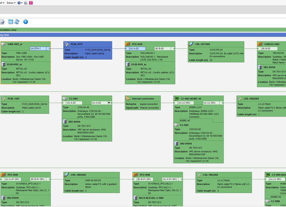 All common cable types are defined in C line. This means that all physical cable connections can be mapped. Structured cabling that includes the patch and configuration cables is required in order to make use of the full functionality when making connections. Plausibility checks with regard to the medium (copper, glass) and connectors prevent input errors. Functions contained in the basic function set include bundled cabling for simultaneous insertion of multi-pair cables into several cabinets and the use of junction boxes.