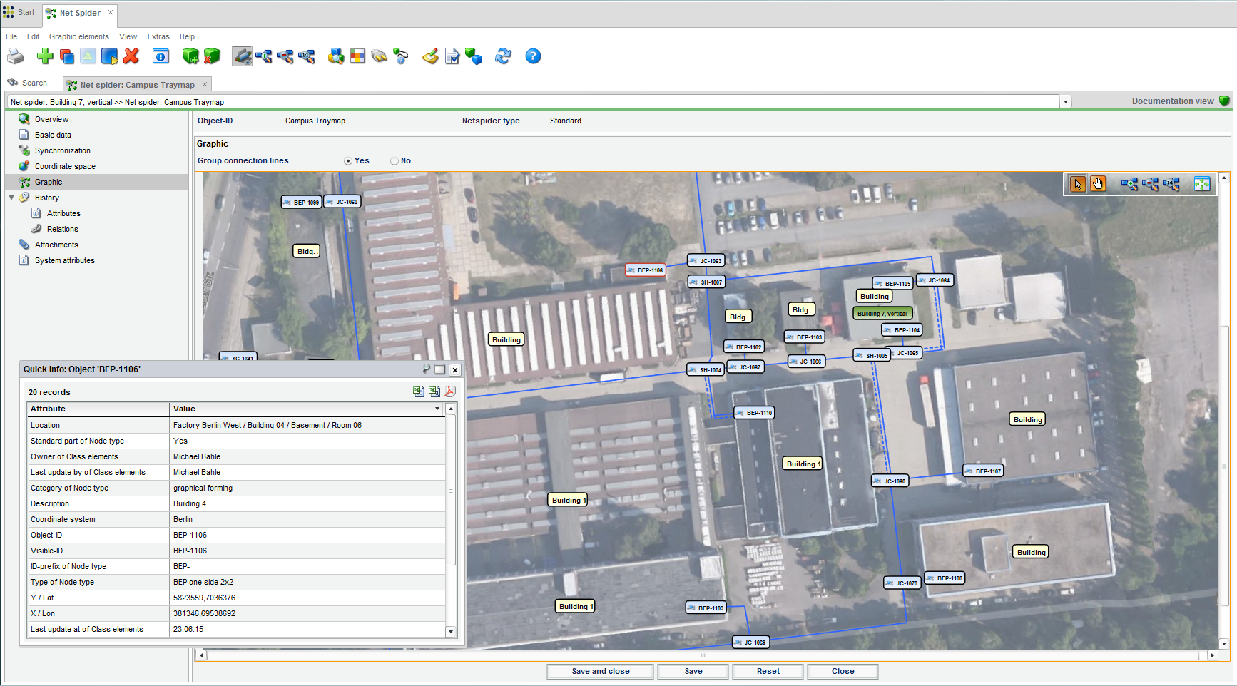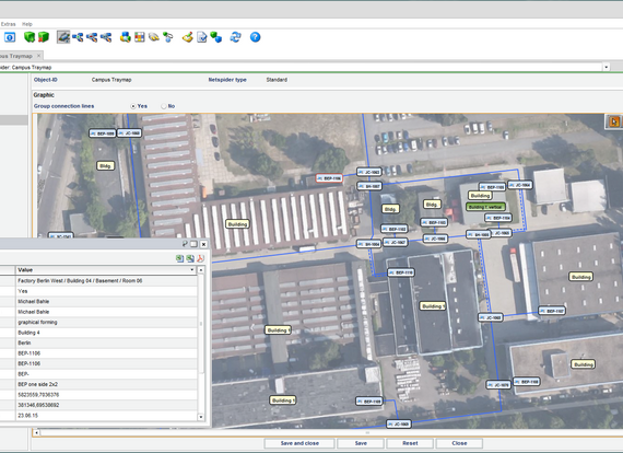 The netspider included in Command enables Command objects to be displayed graphically in the form of a netspider. The connected cables and subsequent objects can be determined for these objects and loaded manually or automatically into the graphic. Freely configurable labels can be used to display information, such as the type, location, and ID, for both objects and connections.