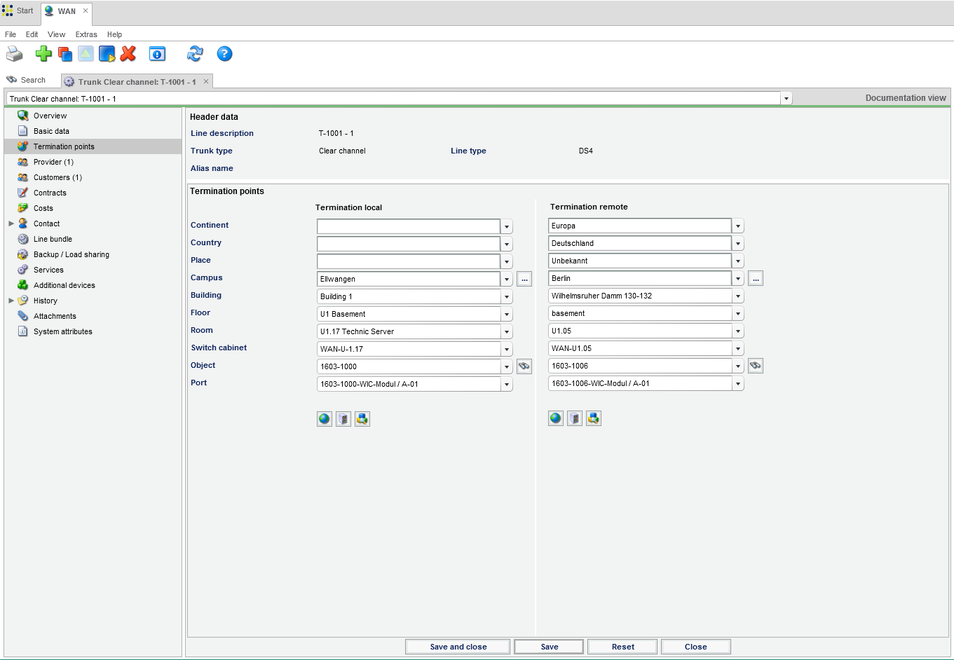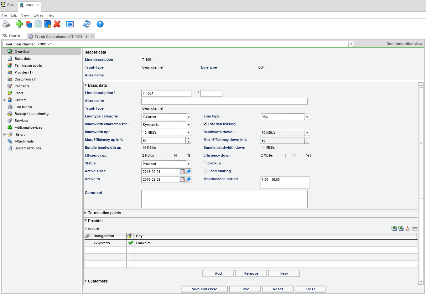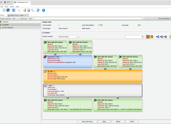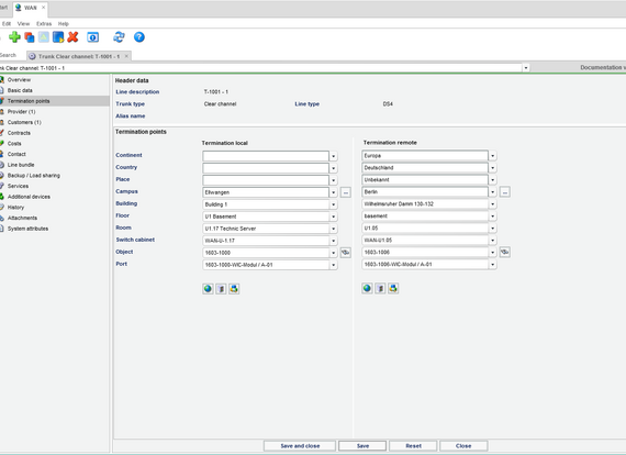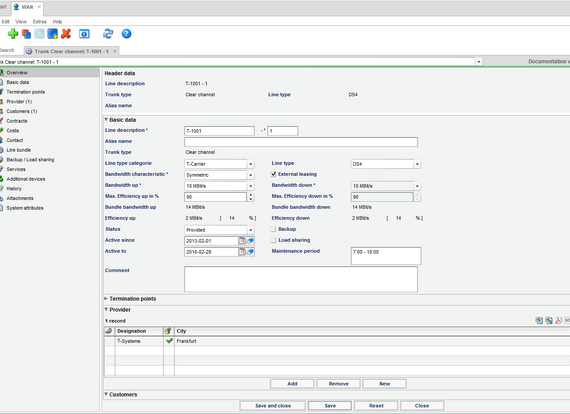 FNT Command WAN allows users to manage wired wide area networks. It is possible to document lines between two locations or lines with only location if only one side is known. Line information, such as the line category, line type, and the available bandwidth, can be recorded. In order to be able to react quickly in the event of an incident, the termination points (right up to the port), provider data, contacts, relevant contracts, and service levels are recorded for each WAN line. By performing a bandwidth calculation of the assigned services provided over the WAN line, it is possible to determine free line capacity quickly and optimize line use. In addition, it is possible to map line bundles, backup lines, and load sharing. The costs incurred for managed WAN lines can also be assigned to the lines as one-time or monthly costs, thus allowing the user to maintain an overview.