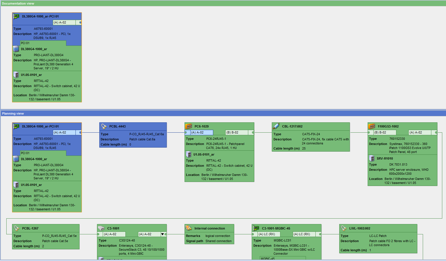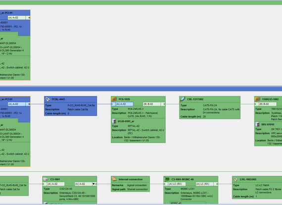Comprehensive documentation and management of physical infrastructures and cabling, including graphical views of switch cabinets, integrated inventory management, end-to-end signal tracing, and network visualization