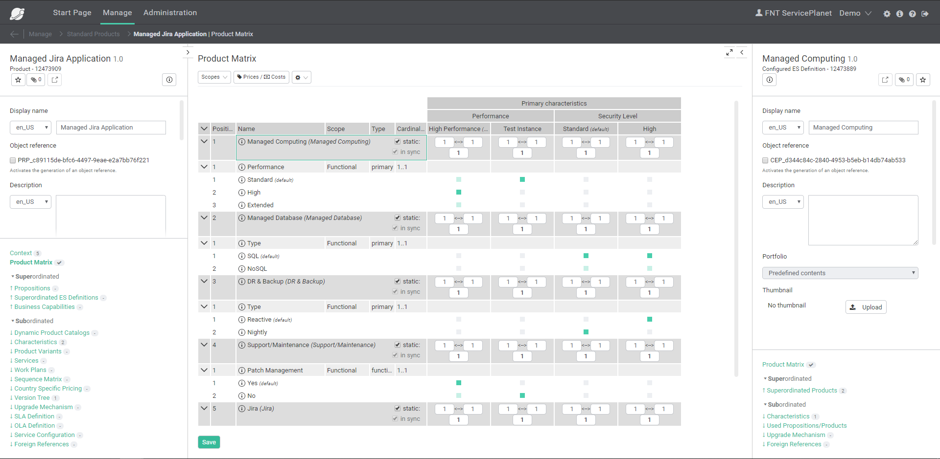 FNT ServicePlanet contains all the information needed to provide the highest level of service management support for a customer's business processes. Before the first service is provided to a customer, product and portfolio managers define the product design and configuration options. Predefined basic modules are reused in new products in order to produce and operate services as cost-effectively as possible. This makes it possible to provide individual customers with all defined products in many variations via a unique, rule-based service creation process (instantiation of services). All information related to products, services, and customers is held centrally in FNT ServicePlanet.