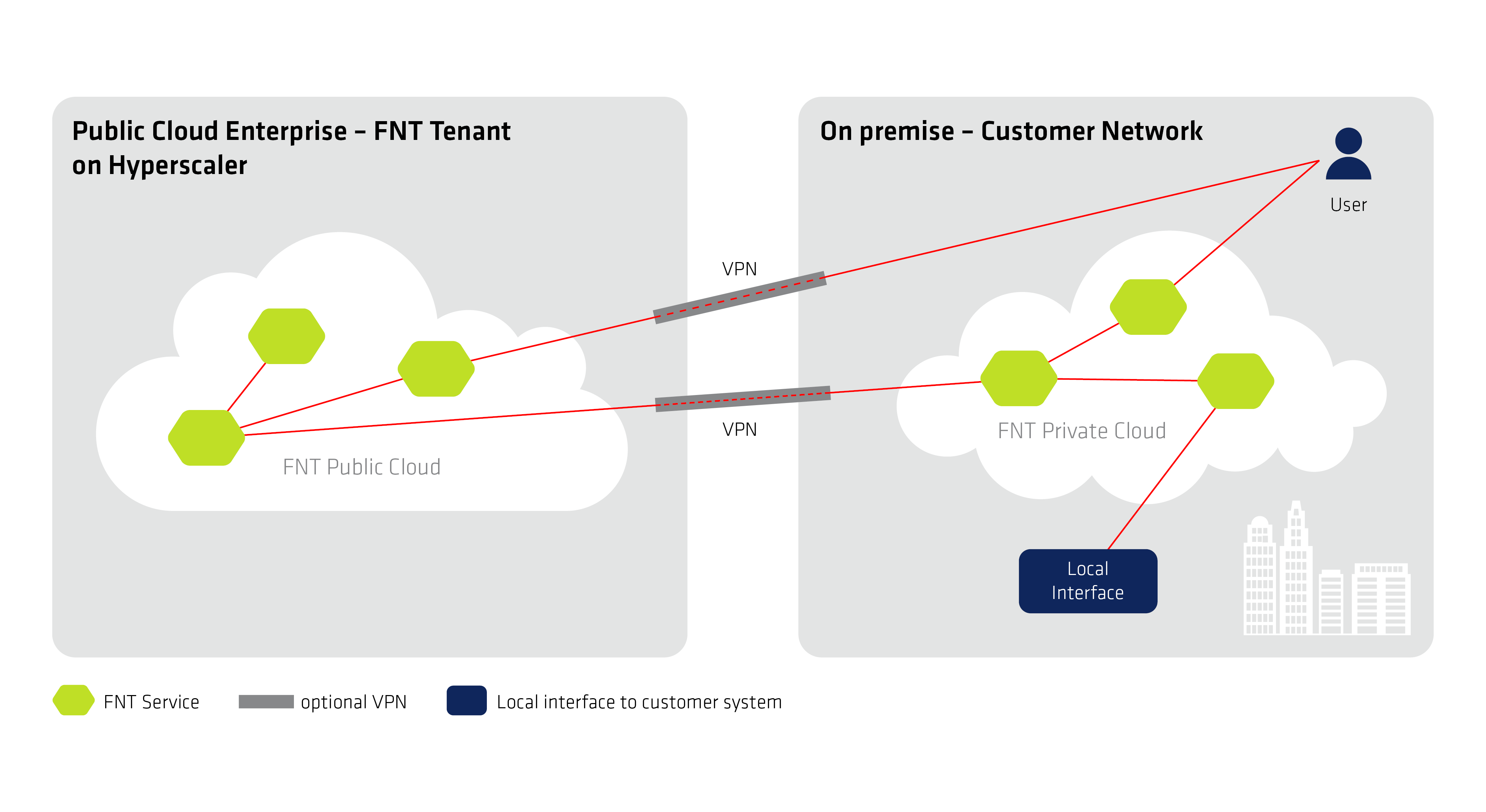 This allows you to flexibly deploy FNT solutions in different operating models to suit your individual requirements – whether private cloud, public cloud, or hybrid cloud. Operation is supported on customer-owned infrastructure as well as on any hyperscaler such as Amazon Web Services (AWS), Microsoft Azure or Google Cloud Platform (GCP).